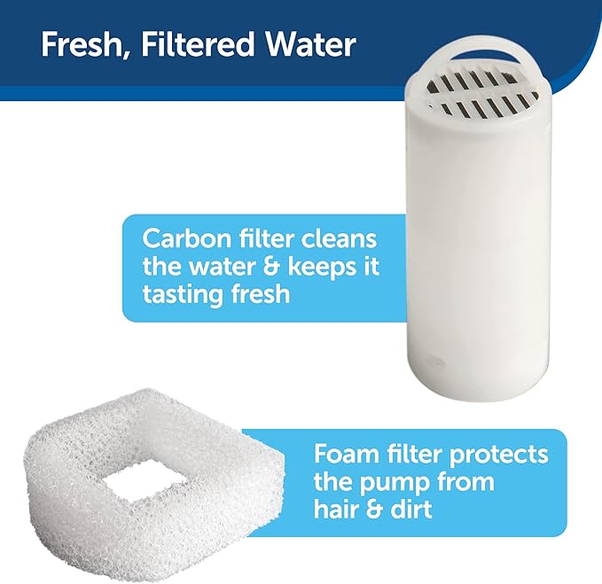 - FRESH, FLOWING WATER: Replaceable carbon filter refreshes water and the foam filter catches pet hair and debris to keep your catโs water clean