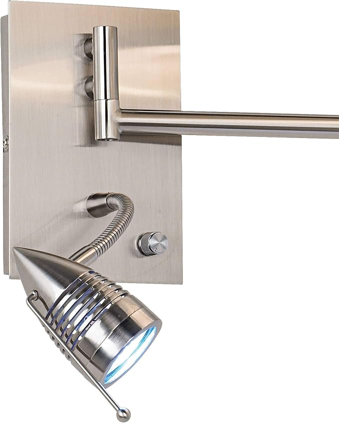 - 【High Quality Lighting】Easy to install, plug-in 2-in-1 swing arm wall light with adjustable gooseneck LED bullet light. From the Possini Euro Design brand. Brushed nickel finish backplate and arm. Off-white drum shade.