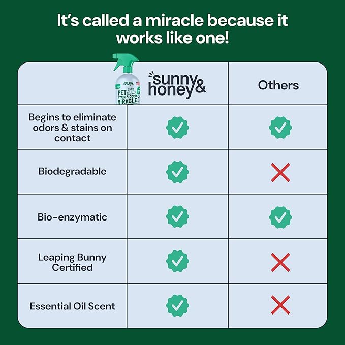 - Powerful Enzymatic Cleaner: Sunny & Honey Pet Stain & Odor Miracle is your go-to for tackling pet messes. This enzyme cleaner for dog urine and poop carpet refreshes your space without harsh odors, making it a fantastic carpet cleaner spray