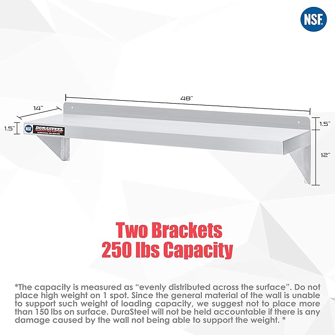 - Premium Construction: Made with 18-gauge stainless steel. Heavy duty commercial grade shelving supports up to 250 lbs. Perfect stainless steel shelf for kitchen, garage storage shelves, or utility racks. Durable metal wall shelf for long-term use