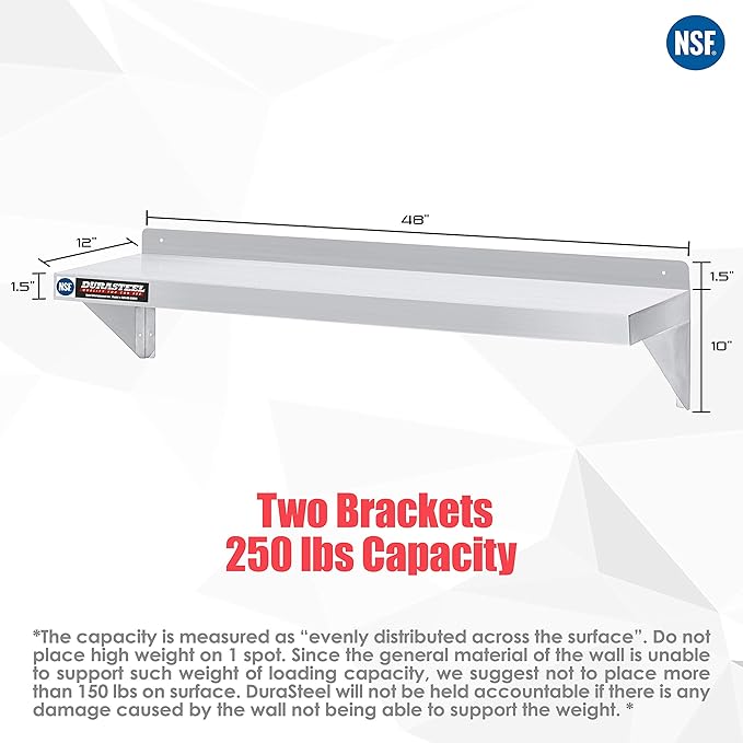 DuraSteel Stainless Steel Wall Shelf - 48" Wide x 12" Deep Commercial Grade - NSF Certified - Industrial Appliance Equipment (Restaurant, Bar, Home, Kitchen, Laundry, Garage and Utility Room)