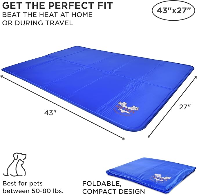 - GET THE PERFECT FIT – This solid-gel cooling mat is 27” x 43” and supports dogs up to 80 pounds to give your pet the most comfortable cooling possible.