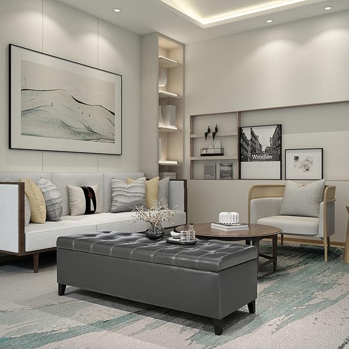 - Durable Elegant and Comfortable:This bench with storage delivers the perfect blend of comfort and durability-Soft synthetic leather paired with high-resilience foam maintains its comfort for years, while the sturdy solid wood frame and thickened support legs reliably support up to 330 pounds. Whether serving as a living room centerpiece, bedroom accent, or home office organizer, this ottoman bench effortlessly combines style and functionality wherever you place it.
