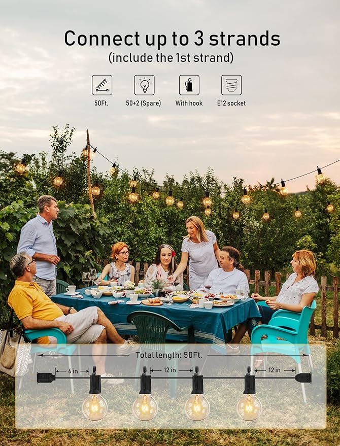 - Energy efficient: 50 feet long patio lights come with 50 clear g40 Bulbs and 2 spare bulb. Light bulbs have candelabra (e12) socket base, 5w per bulb. Perfect for home decor, creating a warm and romantic atmosphere that will make you feel relaxed and happy. End to end connect up to 3 strands