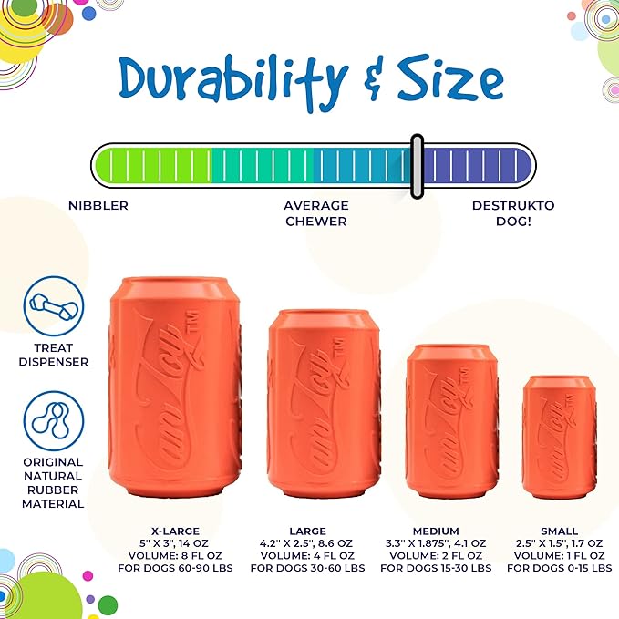 - FUN TREAT DISPENSER & CHEW TOY – Soda anyone? Refresh and invigorate your pup with this can-do Soda Can is both a chew toy & treat dispenser. Fill it with your dog’s favorite wet or dry food, or both and freeze to prolong use. Small 2.5” x 1.5”.