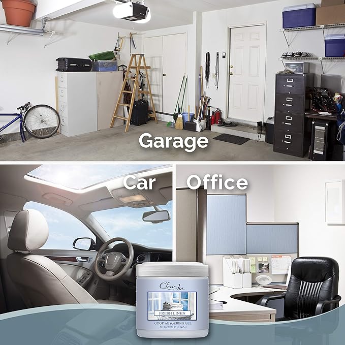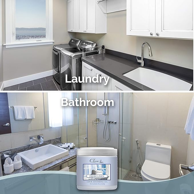 Clear Air Odor Absorber Gel - 15 oz, Pack of 2 - Air Freshener Absorbs and Eliminates Odors in Bathrooms, Cars, Boats, RVs and Pet Areas - Made with Essential Oils - Fresh Linen Scent
