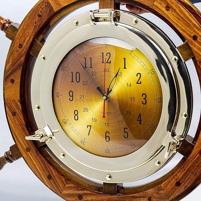 - Porthole Mounted Golden Dial Styled Clock With Absolute Dashing Gold Radial Background | Numeric Dial | The Delicate Yet Prominent Design Of This Beautiful Ship Wheel Is The Perfect Addition To Upgrade The Decor Of Your Living Room, Dining Room, Kitchen, Bedroom Or Entryway | This Timeless Design Features The Perfect Combination Of Style & Nauticality | The Finish Will Coordinate Perfectly With Contemporary, Country Farmhouse, Rustic And Vintage Style Decor.