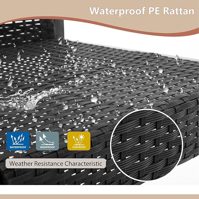 - MODERN STYLE: The patio set includes a table made of high-quality tempered glass for drinks, food, or dรฉcor. This sleek rattan design brings modern elegance and style to your outdoor furniture space.