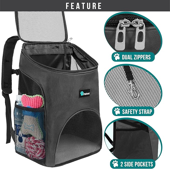 - AIRLINE APPROVED CAT AND DOG CARRIER BACKPACK: The pet carrier backpack is airline-approved and fits under most airplane seats. Lightweight and easy to carry, this tsa approved soft dog carrier backpack for small dogs offers a luxurious ride. The interior of this cat bookbag carrier also comes with a dual zippers and safety strap for pet collar to secure the doggie and prevent escape. The two large side mesh pockets can store pet accessories, stuff, essentials, water bottle, food and treats