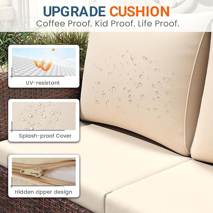 - 【Easy to Maintain Patio Furniture】Cleaning and maintaining this patio furniture is a breeze. The cushion covers can be easily removed with the zipper design, allowing for convenient cleaning. The splash-proof material ensures hassle-free maintenance. Additionally, the tempered glass top of the coffee table can be cleaned by simply soaking a towel in fresh water. For tough stains, soak the towel in water at 100°F for effective cleaning.