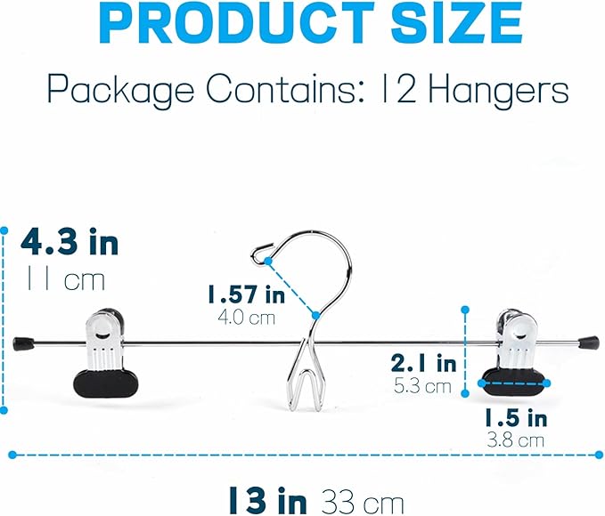 - 【Strong Construction】Made of strong metal and chrome plated process with superior bearing ability, tougher and more durable to hold clothing without bending. Sturdy stainless steel strong construction with space-saving add on hook. Hanger size: 13"L x 4.3"H, Hook open: 1.57". Set of 12 pack.