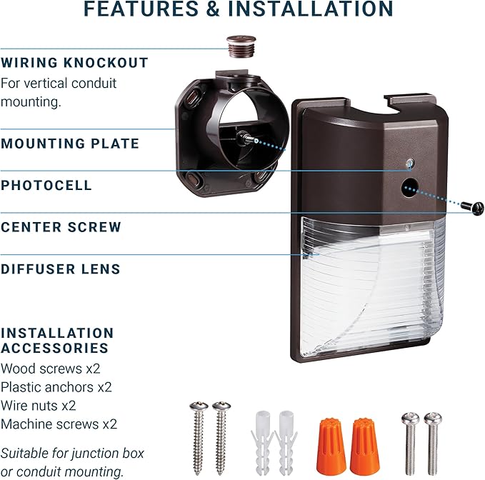 - DUSK-TO-DAWN PHOTOCELL: Built in Dusk-to-Dawn Photocell Sensor included. Automatically turns on at dusk when the sun goes down, and turns off at dawn when the sun comes up again, for maximum energy savings.