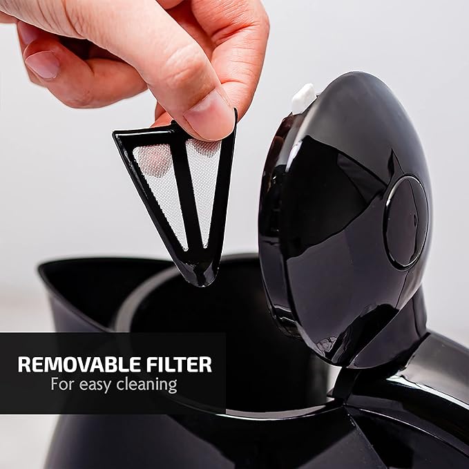 - BOILS WATER IN A FLASH – Operates at 1100W power and boils a full 1.7L of water in just minutes! It’s 50% more efficient than traditional stovetop kettles, helping to reduce your daily electricity usage. The spout is equipped with a removable filter, ensuring debris-free water every time. Simply slide the filter out for easy cleaning and slide it back in for use.