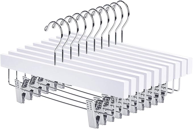 Nature Smile Wooden Pants Hangers Wood Bottom Jeans Skirt Hanger with Clips Anti Rust Hook Pack of 10 (White)