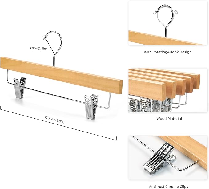 Nature Smile Solid Lotus Wood Deluxe Wooden Pants Hangers Bottom Hanger Jeans Hanger Skirt Hanger with 2-Adjustable Clips Anti-Rust Hook Pack of 10 (Natural)