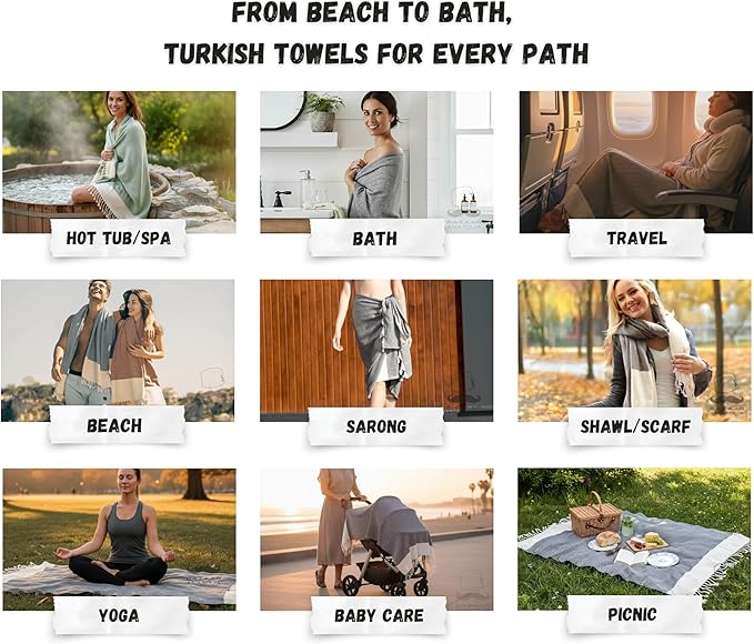 - VERSATILE: There are many ways to use Turkish Beach Towel. You can use the turkish towel as a scarf on the outside, shawl on the terminal, travel blanket on an airplane, oversized beach towel when you get off the plane and go to the beach. Quite useful as a travel beach towel. Or you can use as a bathroom towels, yoga mat towel, pool towel or a blanket in your house.