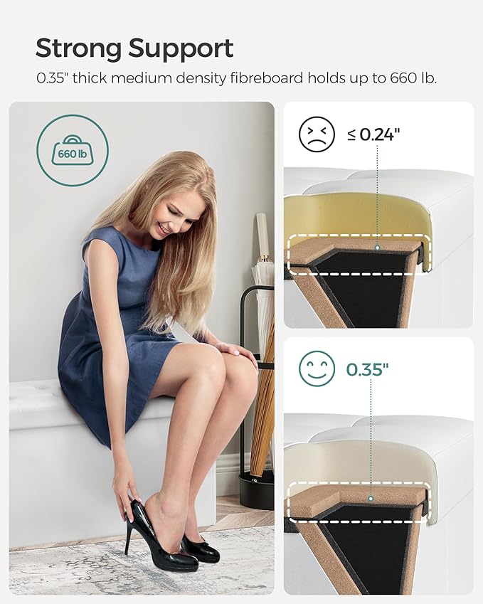 - 【BUILT TO LAST】Featuring sturdy MDF panels for the tops and sides, and a lid reinforced with metal corner guards, the folding storage bench can hold up to 660 lb (300 kg). Its solid construction ensures it will last for years to come