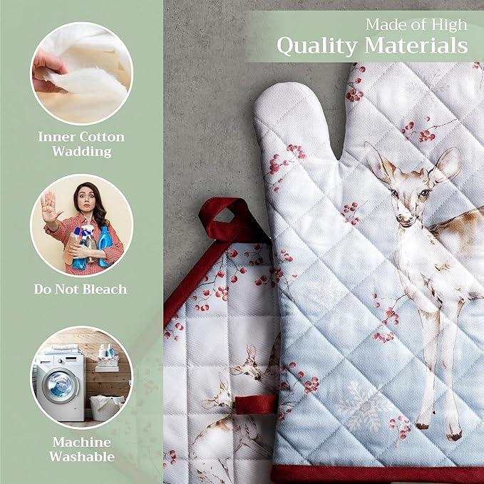 Maison d' Hermine 100% Cotton Oven Mitt & Pot Holder Set (7.5"x13" & 8"x8") Heat Resistant BBQ Cooking Gloves with Loop for Thanksgiving Christmas Decorations Handling Hot Pans (Fairy Tale Forest)