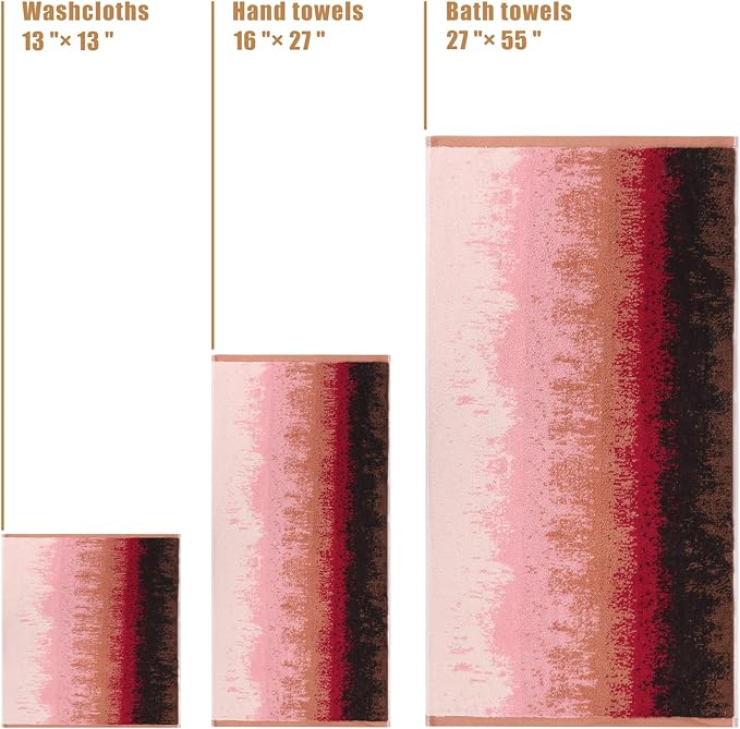 - Inspired by the tranquility of a plum garden, our towels feature a beautifully woven gradient design blending soft pink, deep red, and earth tones, adding an artistic touch and contemporary elegance to your bathroom decor