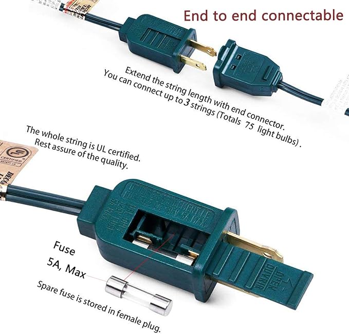 - ❥ END TO END CONNECTABLE: Each set is connectable end to end three times for a total of 75' on one plug. Perfect and versatile for any roofline or outdoor patio application that needs a short length or the ability to have a longer length on one plug.