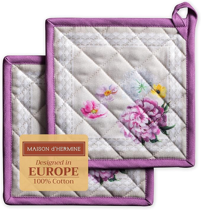 Maison d' Hermine Pot Holders Set 100% Cotton Heat Resistant Potholders 8" x 8" Hot Pads with Loop BBQ, Cooking, Baking, Grilling, Kitchen, Handling Hot Pans Spring/Summer (Pack of 2, Pivoine)