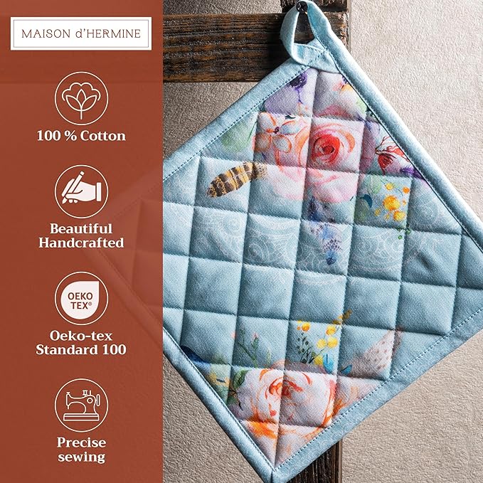 Maison d' Hermine Pot Holders Set 100% Cotton Heat Resistant Potholders 8" x 8" Hot Pads with Loop BBQ, Cooking, Baking, Grilling, Kitchen, Handling Hot Pans Spring/Summer (Pack of 2, Ibiza)
