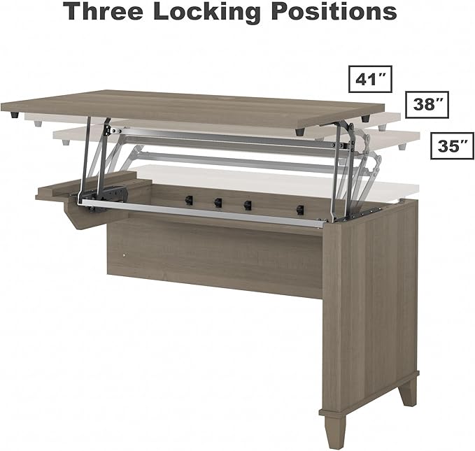 - Lift-n-Lock Desktop can be set at 3 standing height positions: 35, 38 or 41 inches and easily returns to seated height
