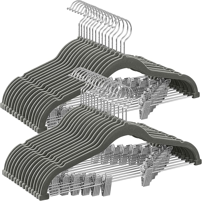 - What's in the Pack: A set of 30 premium velvet hangers and a space-saving option that helps you organize blouse and trousers together using one hanger