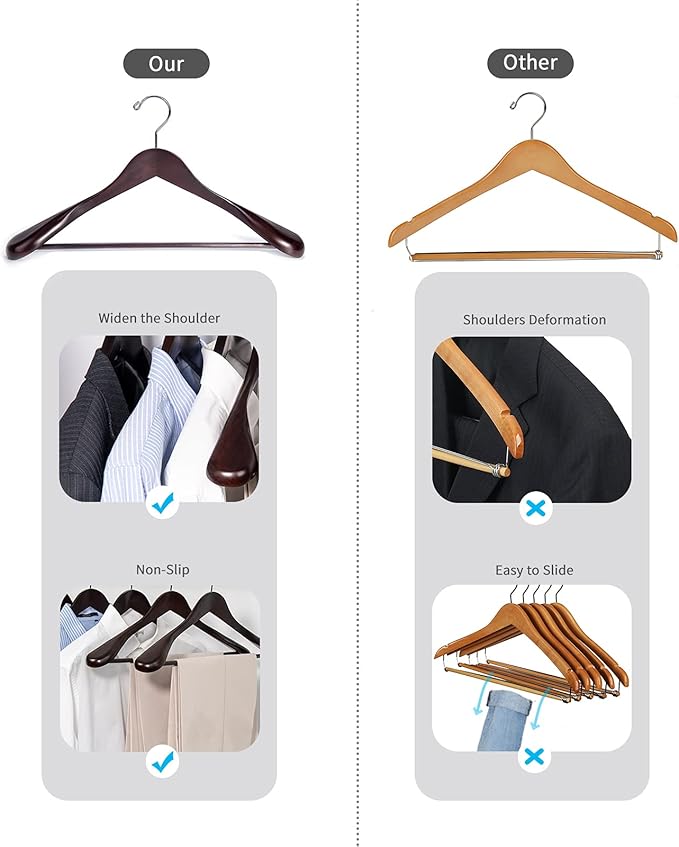 - 360 Degree Swivel Hook - The hook of wood coat hangers is chrome-plated and A 360 degrees retotating design enabling users to easily turn the hanger sideways to check out garments without even removing them from the clothing rack. More sturdy to hang heavy clothes.