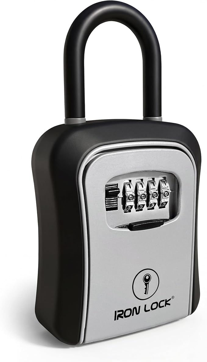 Iron Lock® Key Lock Box Portable with U-Shackle & Wall Mount – Medium Waterproof Heavy-Duty Metal Safe with 4-Digit Combination for Spare Keys Outside on Door Knob, Fence or Gate (Grey, Medium)