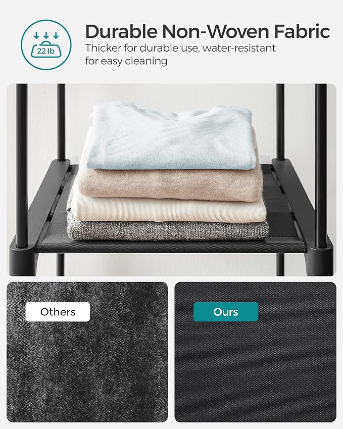 - [It Has the Strength] The 0.4 mm thick hanging rods have a load capacity of 66 lb each and the fabric shelf holds up to 22 lb because it’s supported by four 0.6" dia. metal tubes and strengthened double-sided connectors