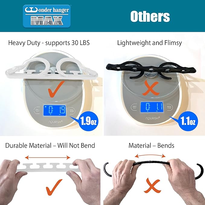 - HEAVY-DUTY DESIGN: Built from heavy-duty, reinforced plastic, the Wonder Hangers are made to last and durable enough to hang heavy jackets, tablecloths, and throw blankets. Crafted from durable materials, it can hold up to 30 lbs per hanger. It's strong enough to hold your bulkiest winter wear yet versatile enough to hang your entire wardrobe with ease. The Wonder Hanger Max is designed to hold a tremendous amount of weight and is arranged vertically to maximize closet space.