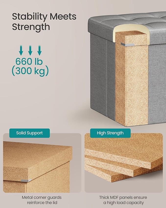 - 【STURDY AND DURABLE】Built with premium MDF panels and reinforced with metal corner guards on the lid, this ottoman is strong enough to support up to 660 lb (300 kg), making it a reliable seating or storage solution that will stand the test of time