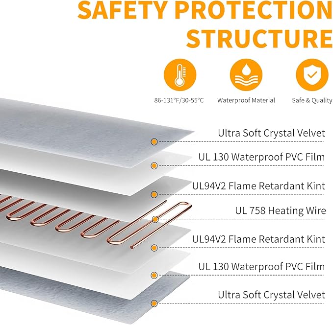 - ❤【Safety and Secure Structure】7-layer protective structure with UL-certified heating wire protect pets from burns. Soft PVC envelope with waterproof and flame-retardant function. Built-in intelligent temperature sensor in the heating pad to prevent overheating to protect pets. Don’t let your pets lay on the pet heating pad without a plush cover.
