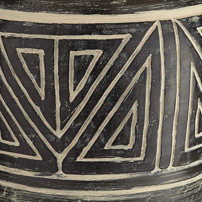 - 【Pre-Assembled Shade】Black, Earth tone finish with decorative pattern. Resin construction. Linen fabric drum shade. Includes 8-foot clear cord and plug.