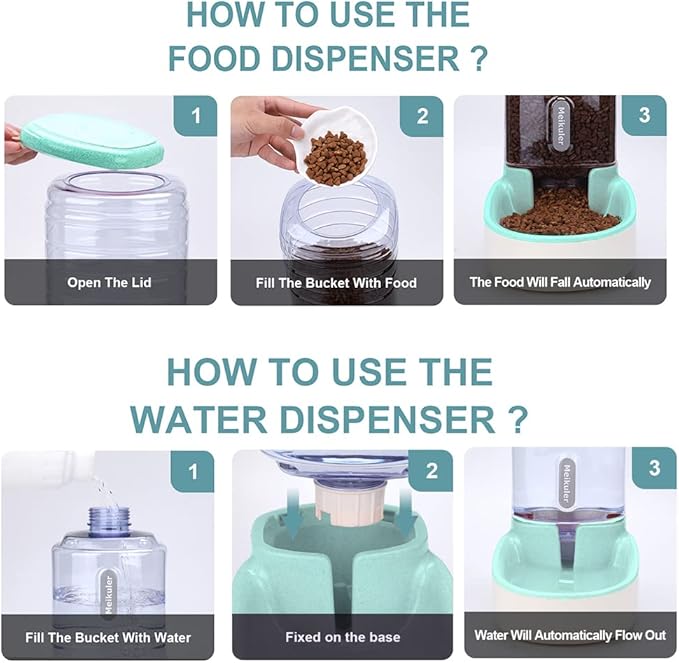 Meikuler Automatic Dog Cat Feeder and Water Dispenser Set,Waterer and Gravity Food Feeder for Small & Medium Dogs Cats Puppies,Large Capacity 1 Gallon x 2 (Green)