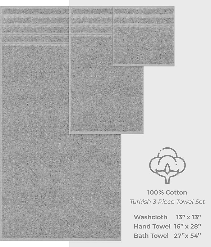 - ✅ Turkish Premium 3 Piece Towel Set Includes 1 Bath Towel of 27 x 54 inches, 1 Hand Towel of 16 x 28 inches and 1 Washcloth of 13 x 13 inches.