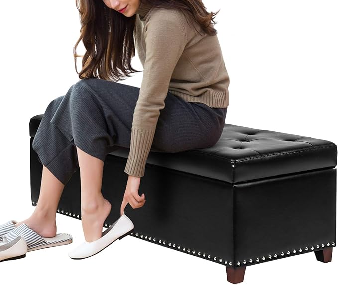 Joveco 47 Inch Storage Ottoman Bench,Tufted Leather Storage Bench with Nailhead Trim for Bedroom (47”,Black)