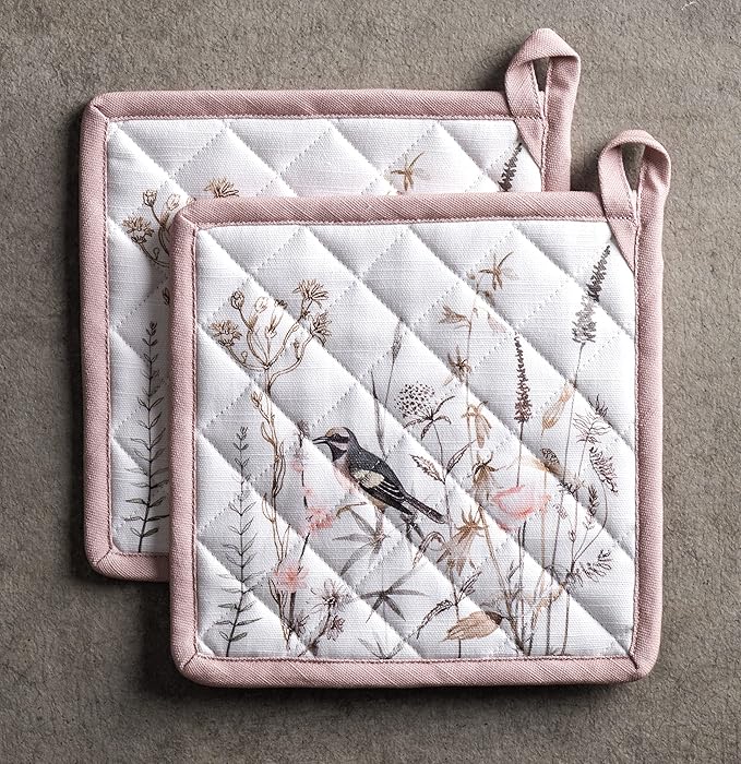 Maison d' Hermine Pot Holders Set 100% Cotton Heat Resistant Potholders 8" x 8" Hot Pads with Loop BBQ, Cooking, Grilling, Kitchen, Handling Hot Pans Spring/Summer (Pack of 2, Meadow Florals - Brown)