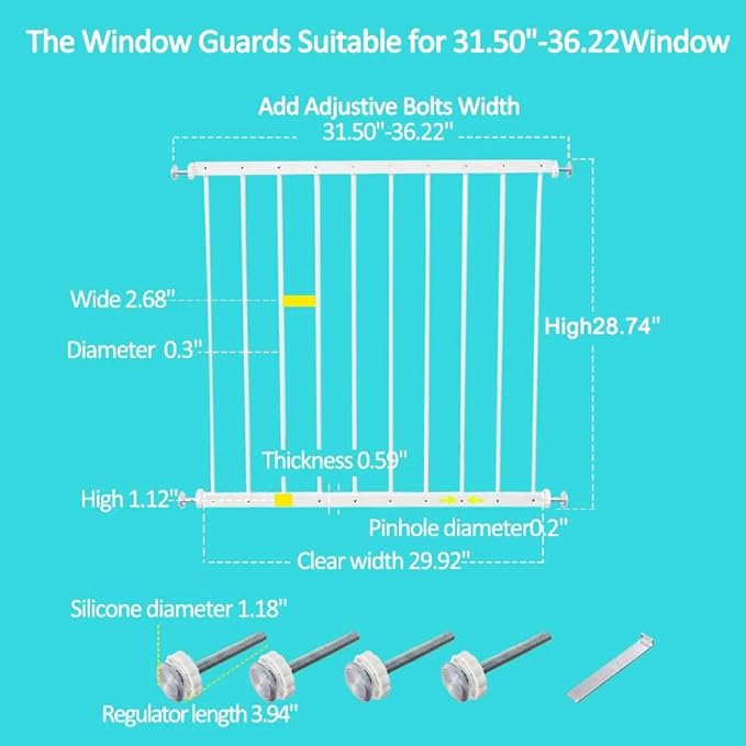- 【Details Design】 The silicone of the adjusting bolt adopts a thread design, which increases the friction between the kids tensioned window guards and the contact surface. The diameter of the small hole at the bottom of the inside winding window guards is 0.197inch, which can effectively prevent the babies from inserting their fingers while playing. The surface of the extra wide proof window safety guards have been painted, is smooth without burrs to prevent the baby from being scratched