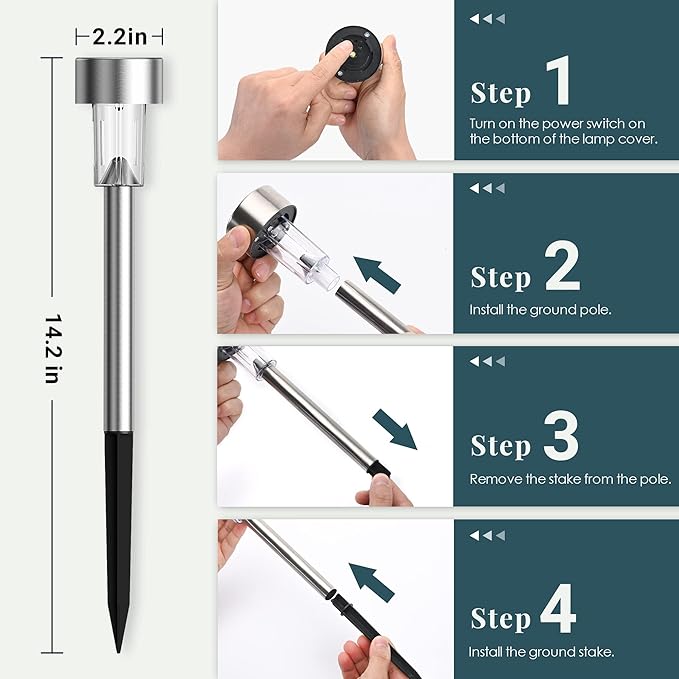 - WIDE APPLICATION:Our solar garden lights as outdoor decorative lights can be use in the garden, lawn, villa, walkway or yard.Our regular customers also provided some creative usage. For example, crating a soothing atmosphere when the solar lights light up