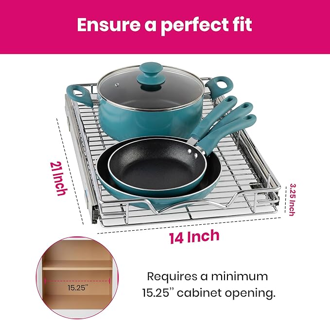 - EASY TO INSTALL & HARDWARE INCLUDED: Our pull out cabinet organizer dimensions measure 14”W x 21”D x 3.15” and includes simple step-by-step instructions along with all of the hardware necessary for easy installation. Installs with just a few simple screws, and Fits cabinet openings 15-1/4”and larger