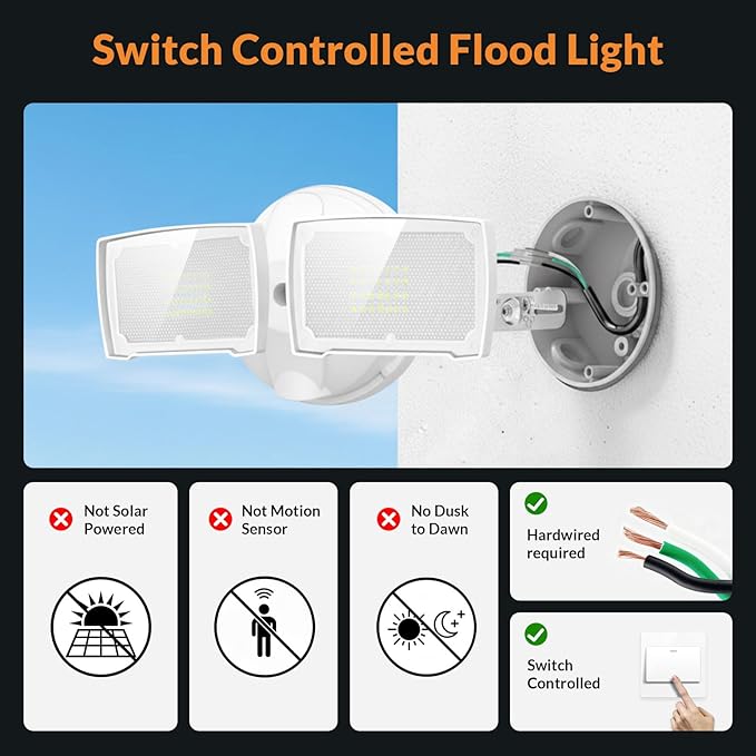 - Switching Control & Wall Mount Installation: Lepower outdoor flood lights can be turned on/off by wall switch. Also exterior flood lights can be easily installed for wall mounting by following a few simple wiring steps; ETL certificated, it brings extra safety to your house(We don't recommend installing it under the soffit or eaves, as this limits the adjustment angle)