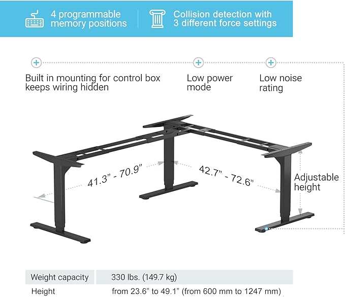 - Triple motor electric standing desk legs. 15 years of warranty for the corner electric desk frame with highest lifting capacity in the market - 330 lbs and 3 stage legs. Powerful and quiet motor with noise rating <45dB.