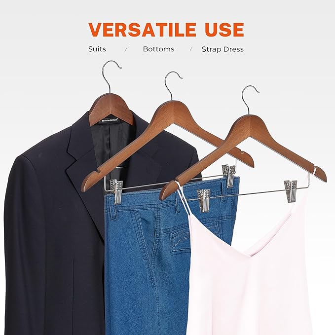 - Multifunctional & Space Saving Hangers - The shoulder line on the wooden hanger is contoured to help preserve clothes shape. There are grooves on each shoulder be used to hang your tank tops, dress, bars, ties, belts, nightgowns,shawls, skirts overalls tightly without slip. What's even more surprising is that we have additionally added two removable metal clips to hang pants of various sizes for you, further saving space in the clothset.