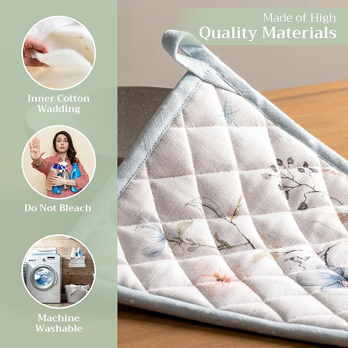- Premium Quality: Crafted from quilted 100% cotton, this heat-resistant pot holder set protects your hands from hot cookware. Each piece features a built-in hanging loop for easy storage and quick access. Perfect for everyday home kitchens, farmhouse kitchens, hotels, restaurants, and bakeries