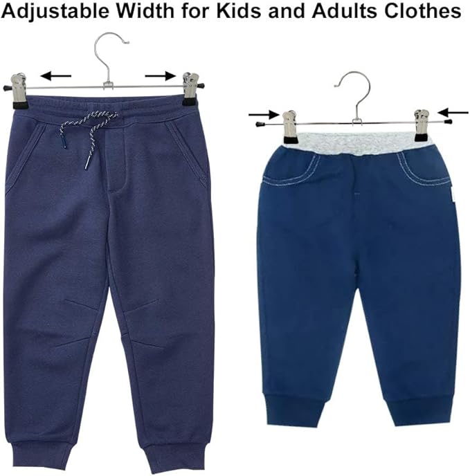 - Adjustable Width --- Skirt hangers for pants with 2 adjustable clips that can rotate 360 °, you can move the clip to fit different sizes of your pants, skirt, hat, tie or kid clothes you want to hang