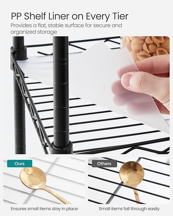 - [A Few Extras] 4 adjustable feet to level the rack and easy-to-clean PP shelf liners to offer a flat surface and protect small items from falling through—this rack with a removable 4-in-1 hook works on every small detail to make your life easier
