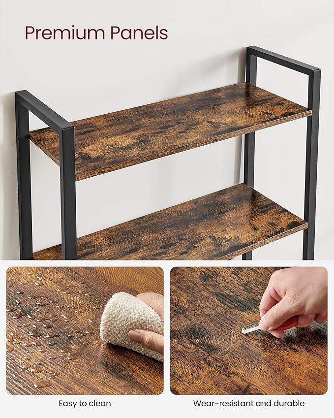 - Embrace an Industrial Vibe: The rustic brown shelves paired with a black steel frame create a stylish industrial look, allowing this freestanding shelf to fit seamlessly in with your home decor and give your space an instant update