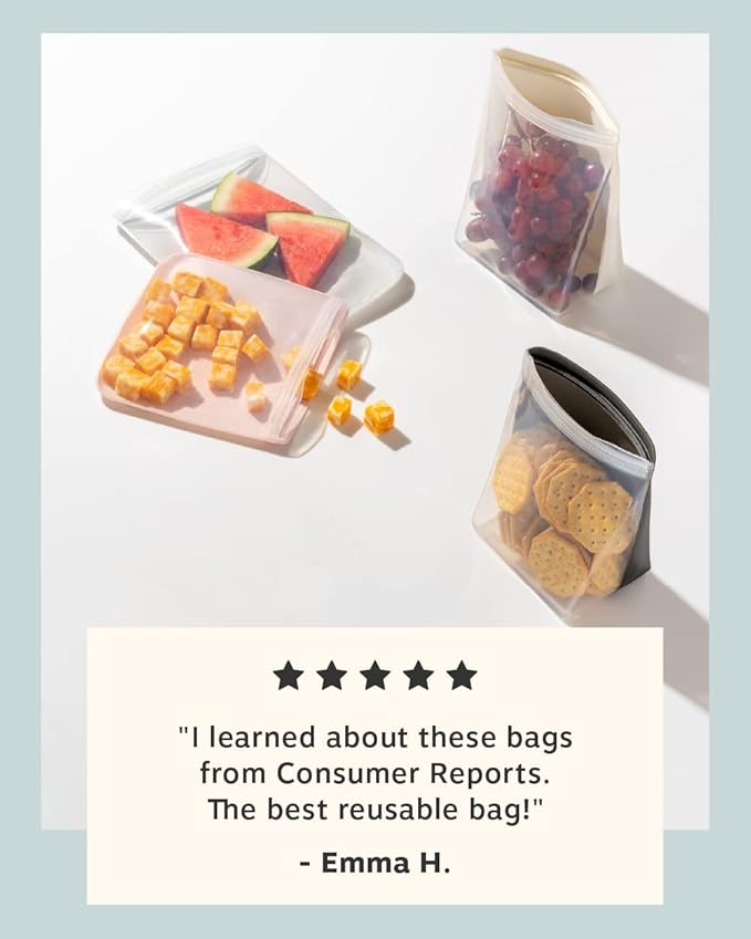 - PLASTIC-FREE: 100% food-grade silicone bags durably constructed from 1 piece of silicone, with no chemicals, glues, or adhesives; Materials exceed US food-grade standards and are safe for dishwasher, microwave and freezer